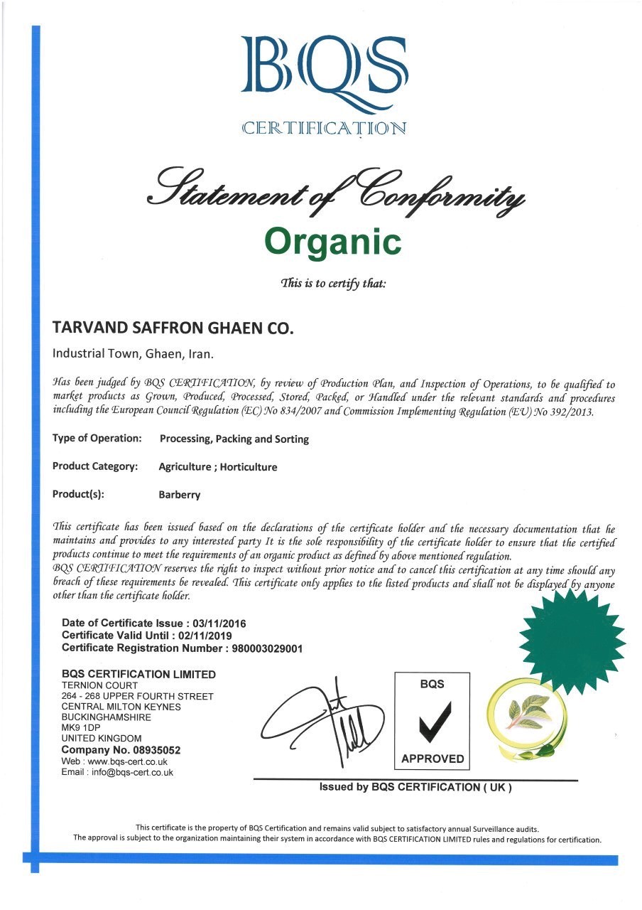 | Tarvand Saffron Ghaen Co. Barberry | Iran | BQS Certification Limited UK | 03.11.2016 | Saffron Barberry |